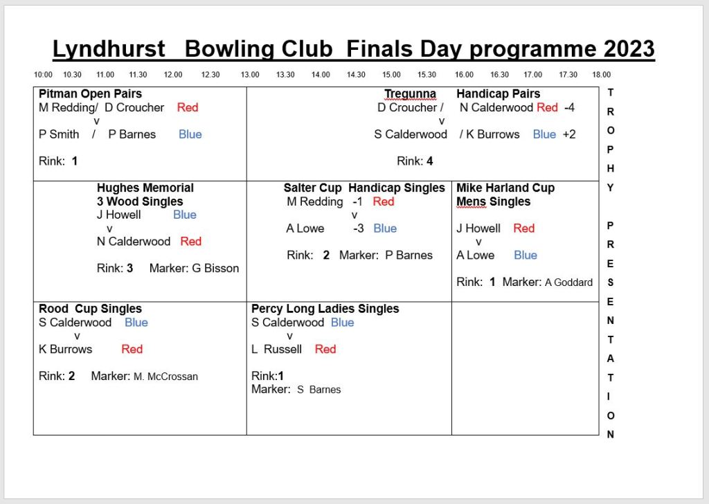 The schedule for Finals Day has been planned and will be as follows: