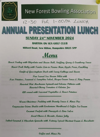 Drawing yourselves to the poster below advertising the NFBA Annual Lunch and Awards on Sunday 24th November (later date this year). Arrive at 12.30 for a 1pm Lunch. The lunch is being hosted at a new venue of Barton On Sea Golf Club, Milton Rd, New Milton BH25 5PP. We have about six members attending already but there is room for more if you would like to attend. Delighted to say we will be collecting the “Ivor Fourmy Trophy” which our 2nd Team won this year which helped to soften our disappointment with relegations from Division 1 and Division 3.